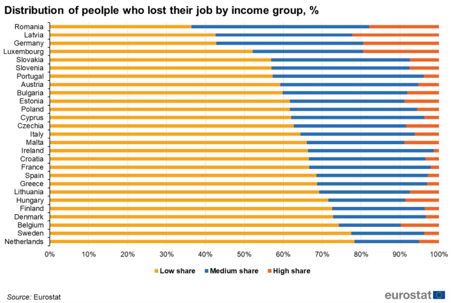 Podatki o izgubi delovnih mest zaradi pandemije COVID-19 se razlikujejo. To je predvsem posledica dejstva, da so države članice EU izgubo delovnih mest nadomestile z različnimi fiskalnimi ukrepi, kot so nudenje finančne podpore za delavce na dopustu in brezposelne, povečanje odpornosti podjetij s programi financiranja, povečanje socialnih in varstvenih plačil itd. Po nekaterih ocenah je kriza COVID-19 vsaj kratkoročno vplivala na do 59 milijonov delovnih mest v EU (ali 26 % celotne delovne sile). To vključuje ukrepe, kot so odpuščanja, trajna odpuščanja in skrajševanje delovnega časa. Ta slika se spreminja od ene države članice do druge, v različnih panogah in na različnih ravneh usposobljenosti.