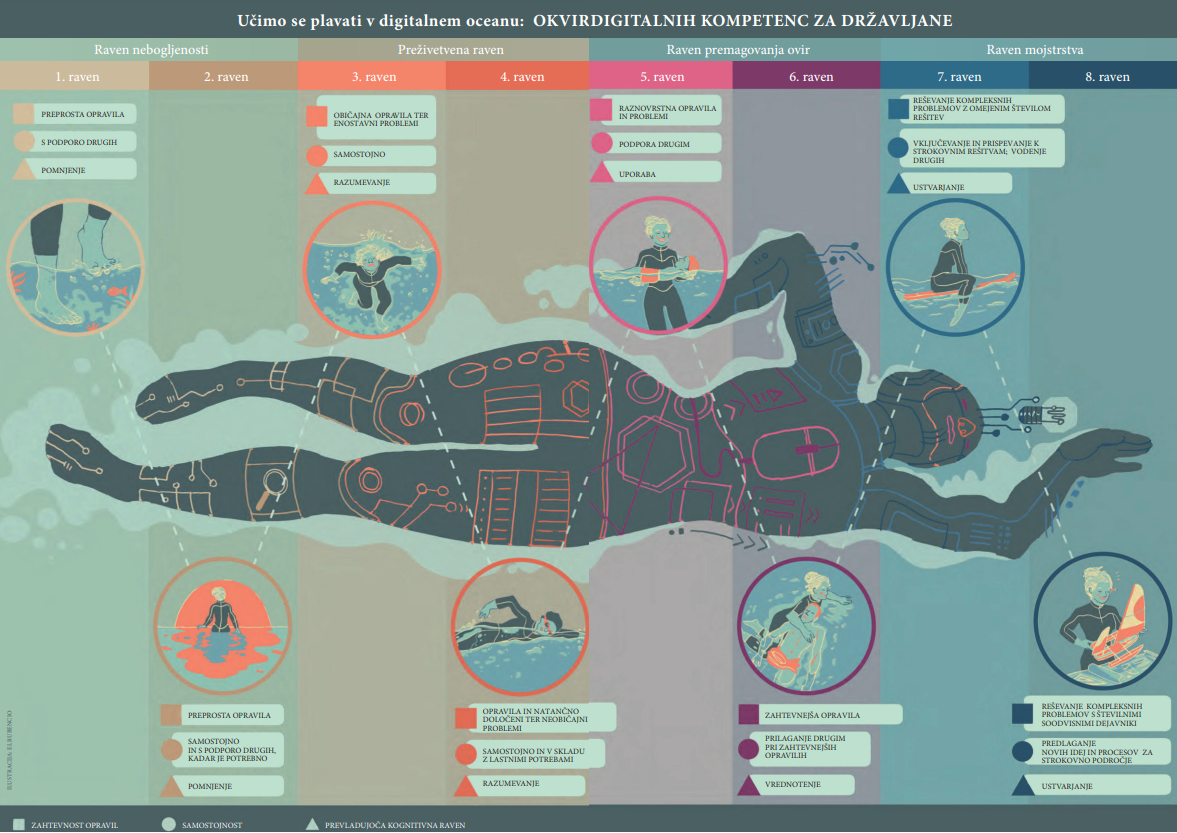 Vseh 5 področij digitalnih kompetenc skozi različne stopnje ponazarja grafika, ki jo je v brošuri o digitalnih kompetencah DigiComp objavil Zavod RS za šolstvo in jo v celoti najdete TUKAJ.