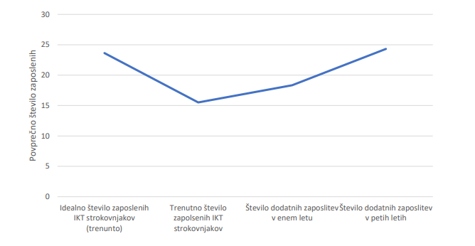 Ob tem velja izpostaviti tudi razkorak med številom trenutno zaposlenih IKT strokovnjakov in idealnim številom zaposlenih. Vrzel se bo, kot kaže, zaradi povečanih potreb po specifičnih digitalnih profilih še povečevala. Prav zato se tako Slovenska digitalna koalicija kot DIH Slovenije v svojih aktivnostih usmerjata v krepitev digitalnih kompetenc mladih in navduševanje za IKT poklice.