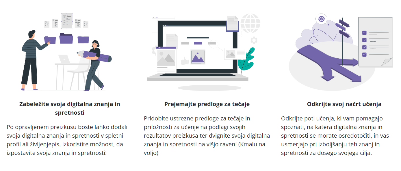 Preiskusite lahko svoja naslednja področja kompetenc: Reševanje težav, Informacijska in podatkovna pismenost, Komuniciranje in sodelovanje, Ustvarjanje digitalnih vsebin in Varnost.
